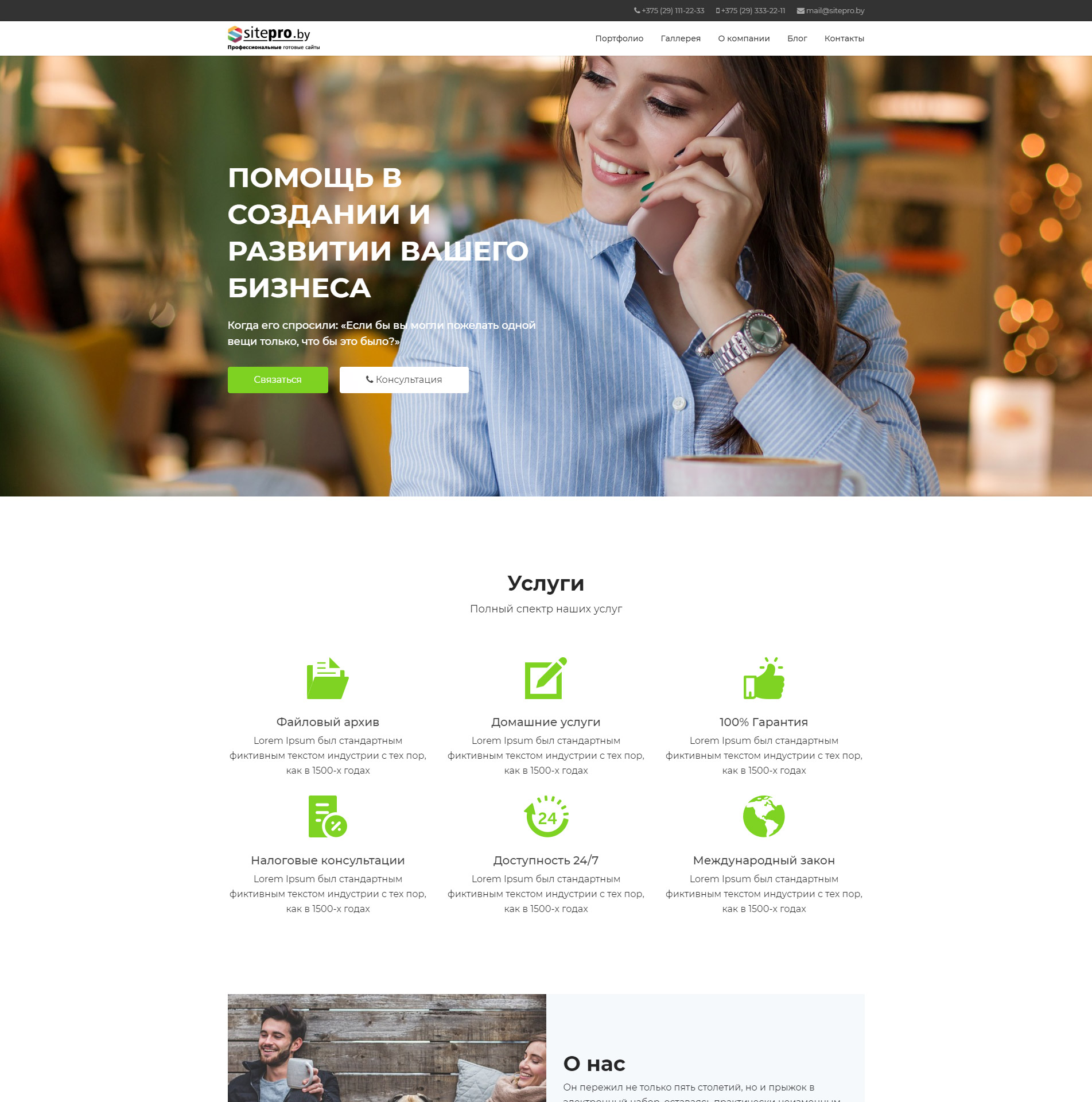 Мы наполним сайт Вашими данными, такие как: телефоны, email, логотип, название сайта, форма обратной связи и фирменные цвета сайта.
