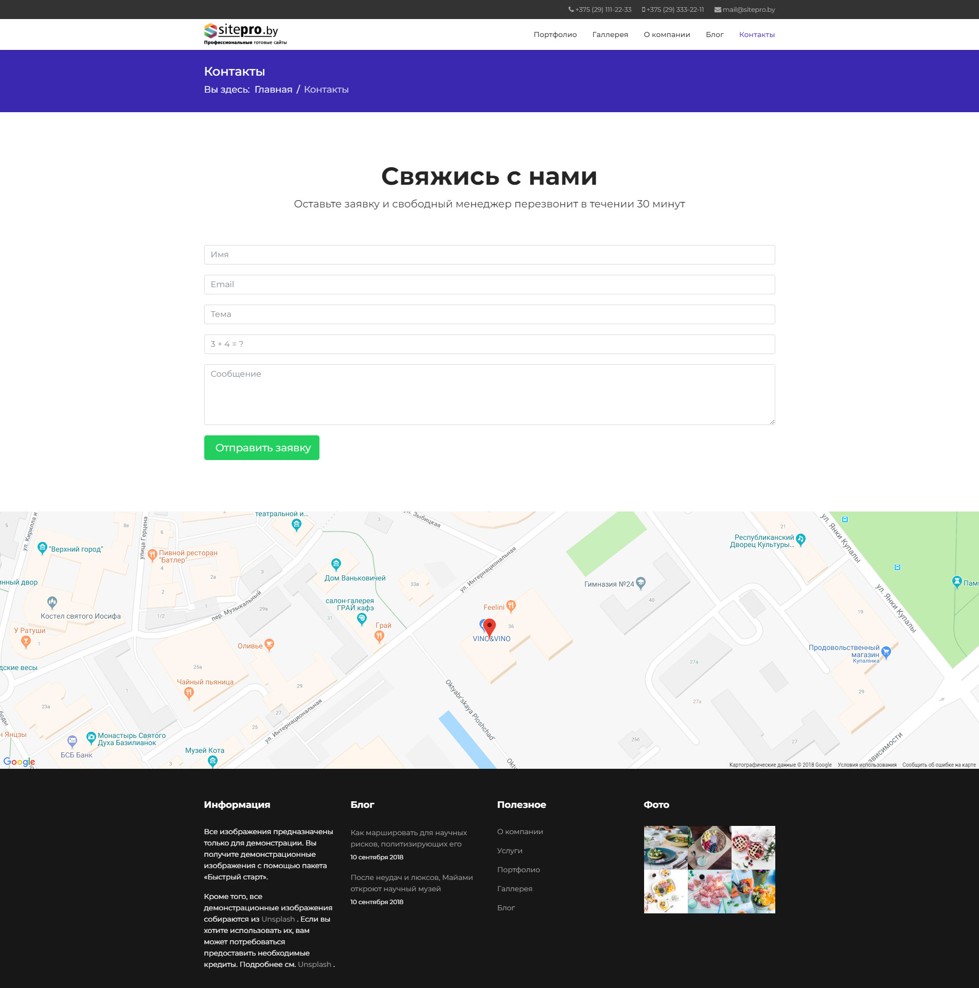 Мы наполним сайт Вашими данными, такие как: телефоны, email, логотип, название сайта, форма обратной связи и фирменные цвета сайта.